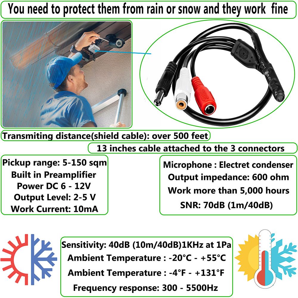 Made of the highest quality materials, this small mic is designed for hidden surveillance cameras, so you can install it in almost any location where it will be invisible to visitors. The clear audio recording from this CCTV mic does not produce any feedback or buzzing sounds, giving you only crisp, clear audio quality. This is the perfect audio microphone for security DVR and CCTV systems. The audio microphone easily connects to audio cables up to 500 feet long giving you plenty of length for an easy installation with no loss of quality. You can connect the audio cable 2 in 1 or 3 in 1 to your microphone generating the clearest sound with your system. You need to protect them from rain or snow and they work fine.